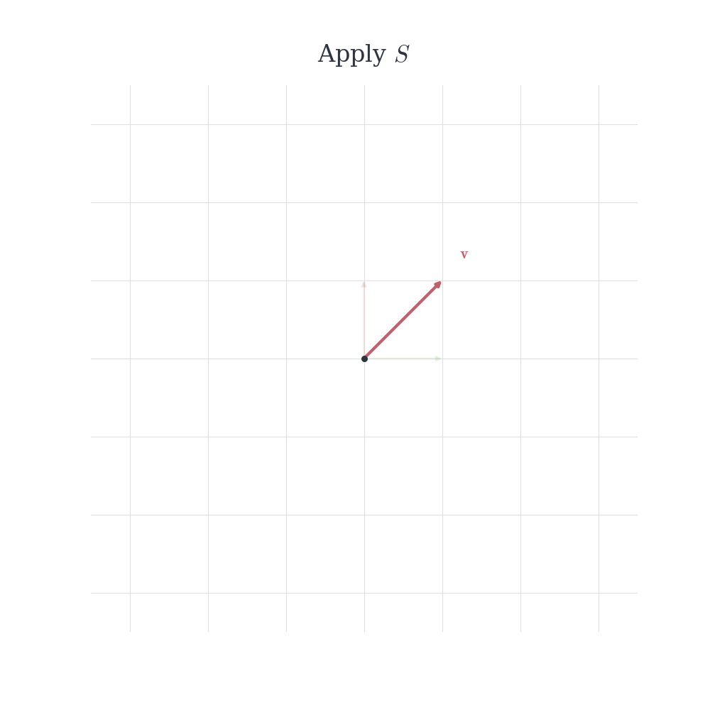 Definition 8.4 (Linear Map in \mathbb{R}^2) A map T : \mathbb{R}^2 \to \mathbb{R}^2 is linear if for all \mathbf{u}, \mathbf{v} \in \mathbb{R}^2 and all scalars c \in \mathbb{R},