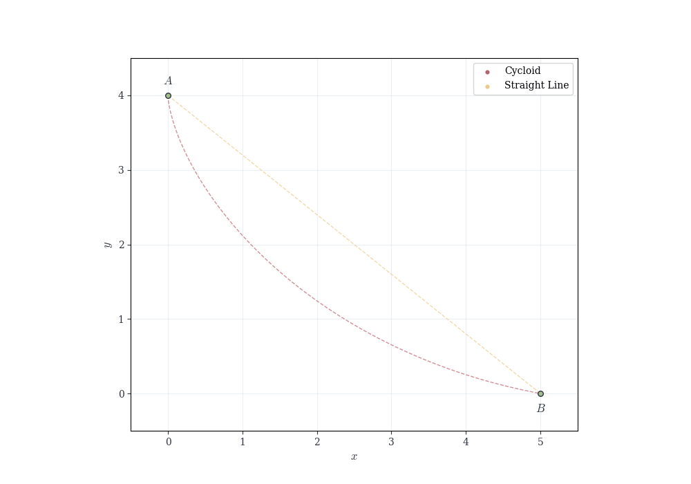 Example 7.4 (The Brachistochrone Problem) In 1696, Johann Bernoulli posed the problem: given two points A and B in a vertical plane, determine the curve along which a particle, moving under gravity alone, travels from A to B in the shortest time.