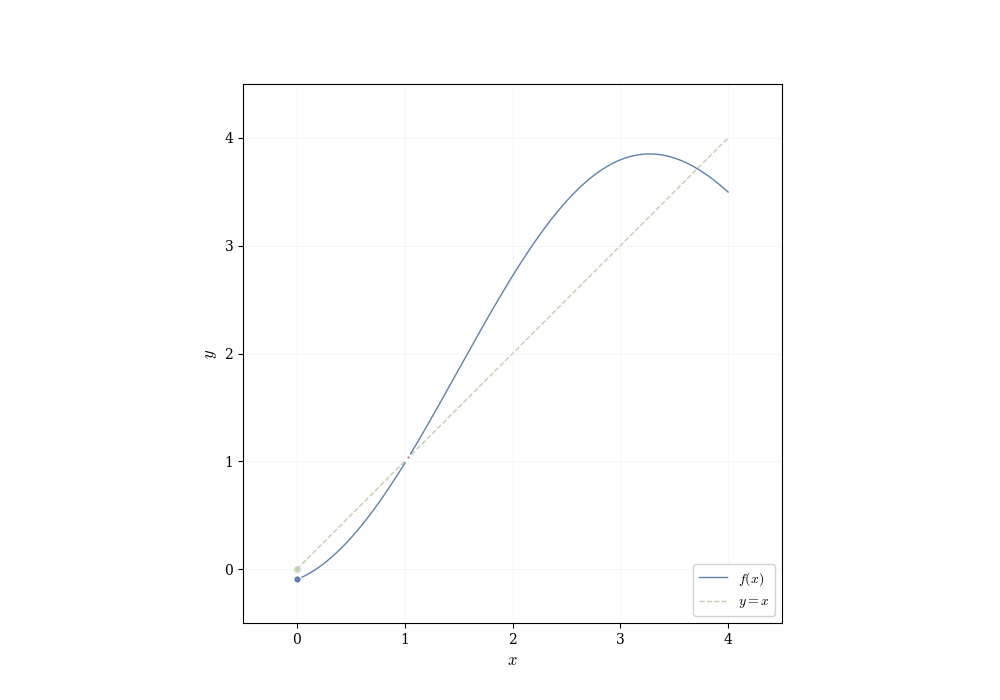 This existence principle extends beyond polynomials. The equation \cos x = x has a solution in (0, \pi/2) because f(x) = \cos x - x satisfies f(0) = 1 > 0 and f(\pi/2) = -\pi/2 < 0. Similarly, transcendental equations like e^x = 2 - x can be shown to have solutions by verifying sign changes of g(x) = e^x - 2 + x on appropriate intervals.