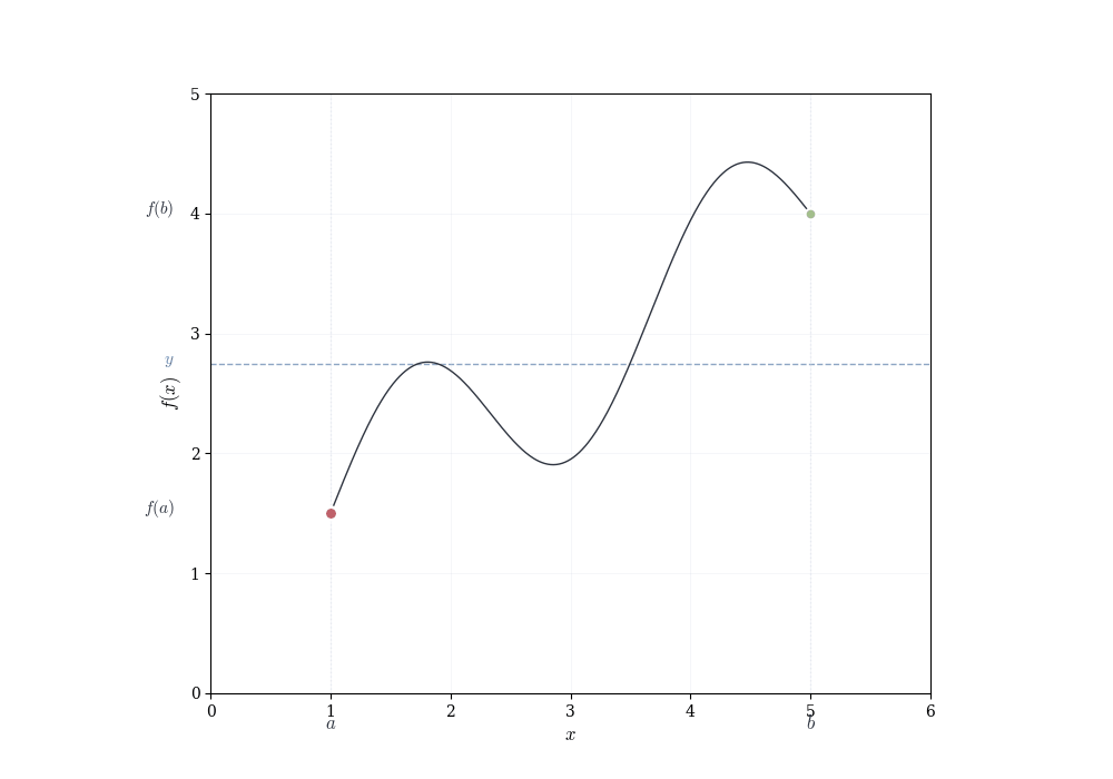 Theorem 7.3 (Intermediate Value Theorem) Let f : [a,b] \to \mathbb{R} be continuous. If y lies strictly between f(a) and f(b), then there exists c \in (a,b) such that f(c) = y.