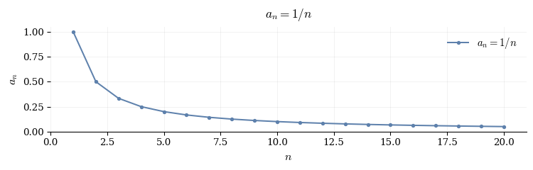 The first two examples are entirely abstract; the third reminds us that sequences often encode empirical observations. In each case, we study the same mathematical object—a function from \mathbb{N} to \mathbb{R}—but the interpretations differ.