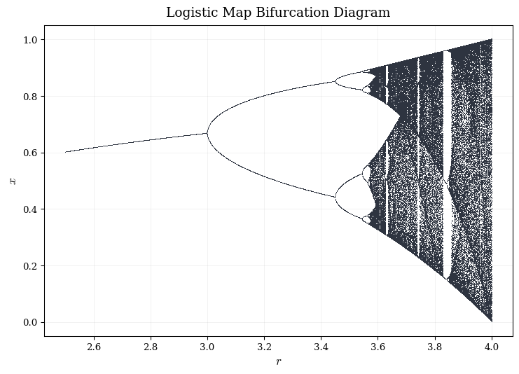 This sensitive dependence on initial conditions exemplifies deterministic chaos. Despite the absence of randomness, the long-term behavior of (x_n) is effectively unpredictable. The bifurcation diagram below illustrates this transition from order to chaos.