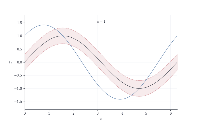 The animation shows f_n converging uniformly to f. The \varepsilon-tube (shaded red region) surrounds the limit function. As n increases, the blue curve settles entirely within this tube—uniform convergence means the entire graph fits for all x simultaneously once n is large enough.