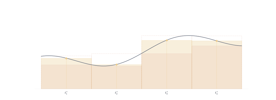 Riemann sums (yellow rectangles) oscillate within the Darboux bounds (orange lower, red upper dashed). The sample points t_i^* move back and forth, but the total sum remains trapped between L(f,P) and U(f,P).