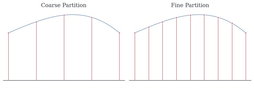 Definition 8.3 (Upper and Lower Sums) L(f, P) = \sum_{i=1}^{n} m_i (x_i - x_{i-1}), \quad U(f, P) = \sum_{i=1}^{n} M_i (x_i - x_{i-1}).