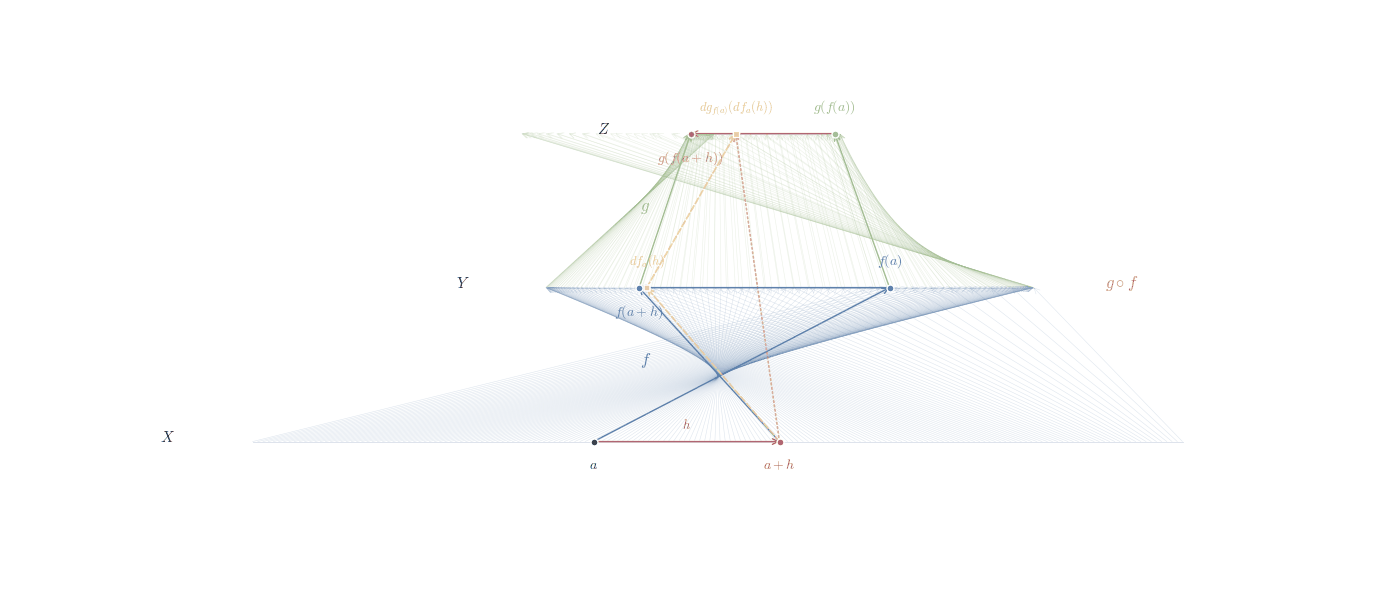 The chain rule says: differentials compose by composition of linear maps. The derivative of a composition is the composition of derivatives. Once you understand that df_a is a linear map, the chain rule becomes inevitable.