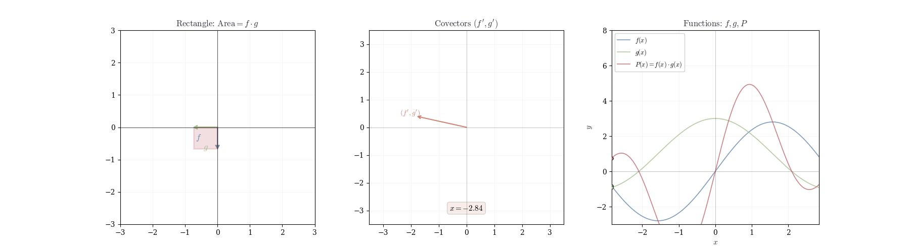 The product rule expresses d_a(fg) as a linear combination d_a(fg) = f(a) \cdot dg_a + g(a) \cdot df_a. This is not the product of differentials but a weighted sum. When we displace from a to a+h, both f and g change. The product changes in two ways: first, g varies while f remains frozen at f(a), contributing f(a) \cdot dg_a(h); second, f varies while g remains frozen at g(a), contributing g(a) \cdot df_a(h). The term df_a(h) \cdot dg_a(h), representing simultaneous variation, is proportional to h^2 and vanishes in the first-order approximation.