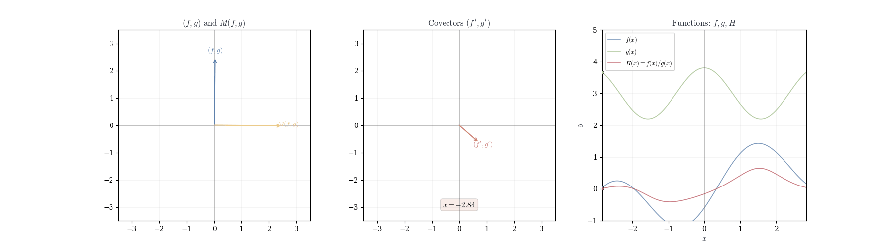 This antisymmetry can be encoded in a linear map. Define T: \mathbb{R}^2 \to \mathbb{R}^2 by T(x, y) = (y, -x). This swaps coordinates and negates the second. Observe that \begin{pmatrix}x&y\end{pmatrix}\,T(x,y) = xy - xy = 0—the output is orthogonal to the input. The quotient rule becomes d_a\left(\frac{f}{g}\right) = \frac{1}{[g(a)]^2} \begin{pmatrix}df_a & dg_a\end{pmatrix}\, T(f(a), g(a)). When f and g change proportionally—when df_a = \lambda dg_a—the vectors (df_a(h), dg_a(h)) and (f(a), g(a)) are parallel. After applying T, they become orthogonal, and the differential vanishes. This is why (f/g)' = 0 when f and g are scalar multiples.