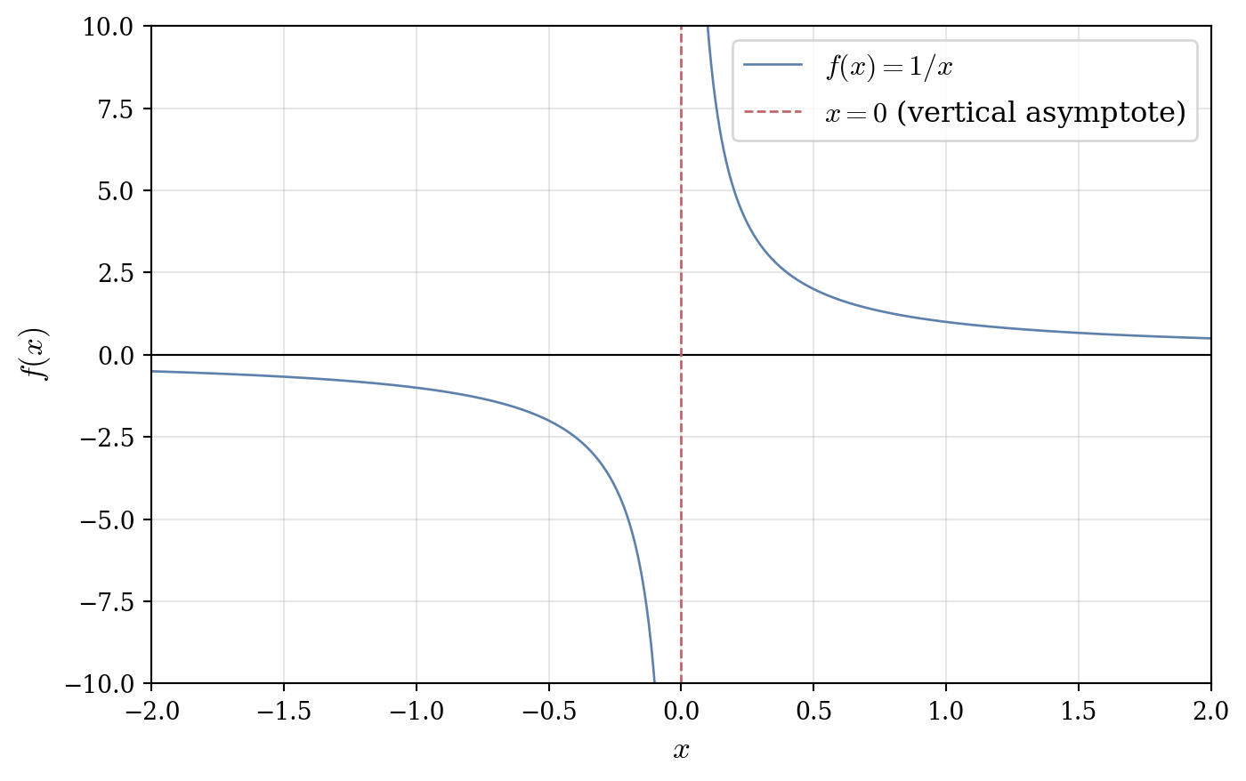 Hence \lim_{x \to 2} f(x) = \infty. We say x = 2 is a vertical asymptote. If \lim_{x \to \infty} f(x) = L, then y = L is a horizontal asymptote.