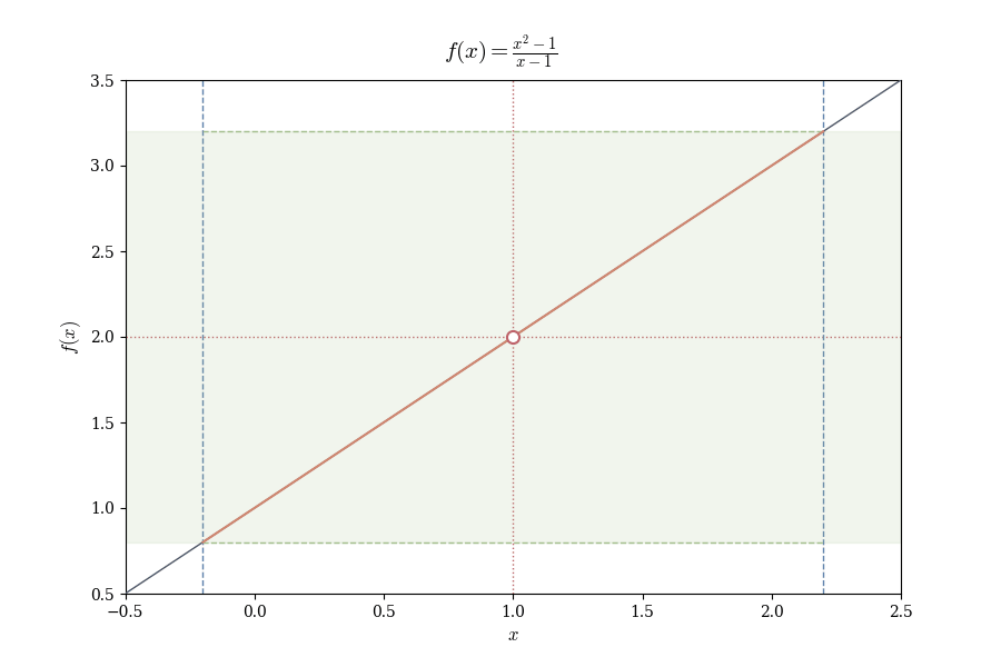 As x approaches 1, f(x) approaches 2. We write \lim_{x \to 1} f(x) = 2, despite f(1) being undefined.