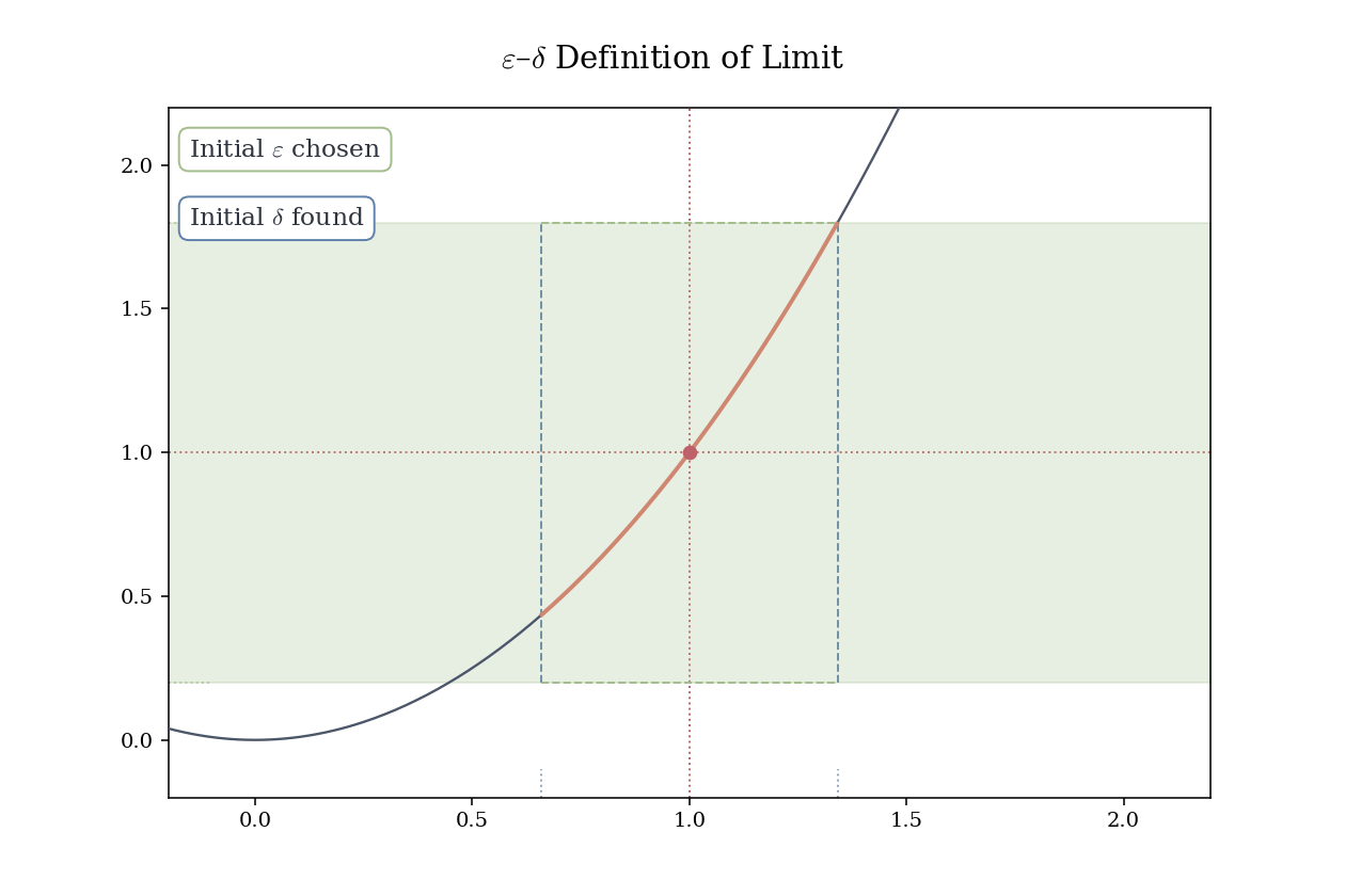 Note: The statment |x - a| < \delta means x lies in the interval (a - \delta, a + \delta). While 0 < |x - a| excludes x = a itself. The function’s value at a is not relevant; only its behavior near a matters. Finally, |f(x) - L| < \varepsilon means f(x) lies in the interval (L - \varepsilon, L + \varepsilon).