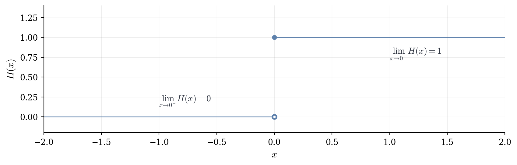 • \lim_{x \to 0^-} H(x) = 0 (approaching from the left, H(x) = 0)