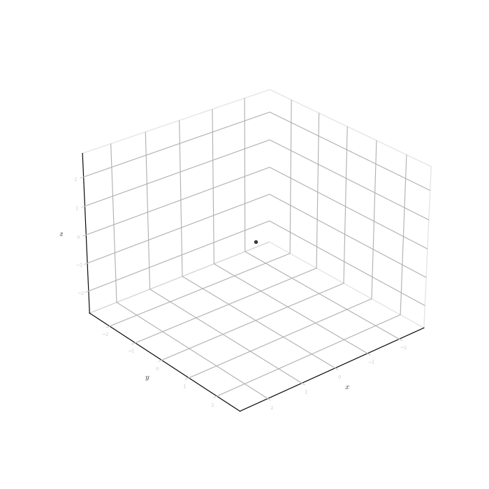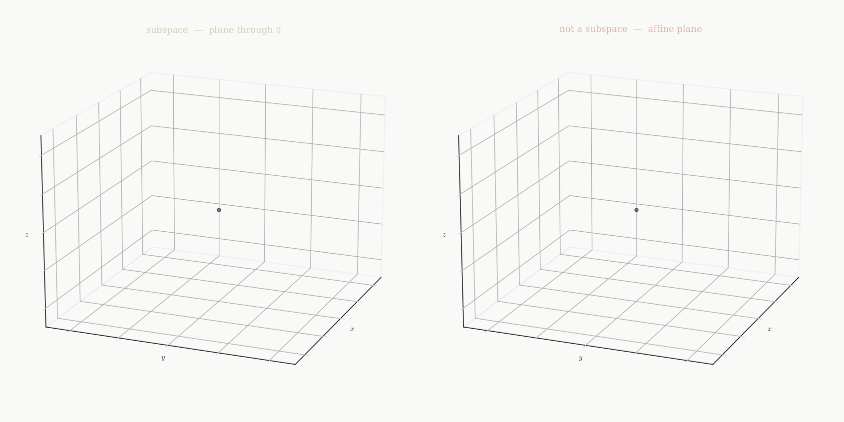Solution sets of homogeneous linear equations. Consider the equation ax + by + cz = 0 in \mathbb{R}^3. The solution set is a plane through the origin, which is a subspace. The zero vector (0,0,0) satisfies the equation. Sums of solutions are solutions (linearity of the equation). Scalar multiples of solutions are solutions.