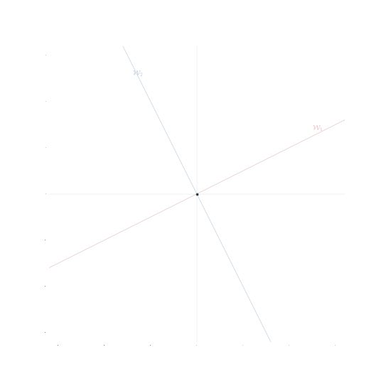 Definition 2.3 (Sum of Subspaces) If \mathcal{W}_1, \mathcal{W}_2 \subseteq \mathcal{V} are subspaces, their sum is \mathcal{W}_1 + \mathcal{W}_2 = \{w_1 + w_2 : w_1 \in \mathcal{W}_1, w_2 \in \mathcal{W}_2\}.