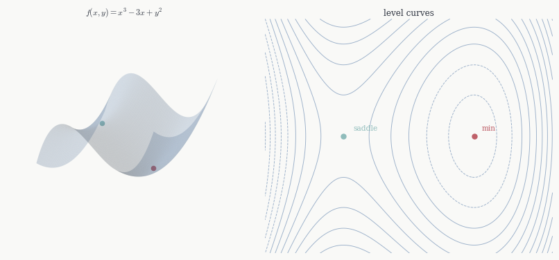 Example. Take f(x,y) = x^3 - 3x + y^2. The critical points come from \nabla f = (3x^2-3, 2y) = 0, giving (\pm 1, 0), and Hf(x,y) = \begin{pmatrix} 6x & 0 \\ 0 & 2 \end{pmatrix}. At (1,0): \det H = 12 > 0 and A = 6 > 0, so a local minimum with f(1,0) = -2. At (-1,0): \det H = -12 < 0, so a saddle. Notice that f has no global minimum on \mathbb{R}^2 — it goes to -\infty along the x-axis as x \to -\infty — so the local minimum at (1,0) is not a global one.